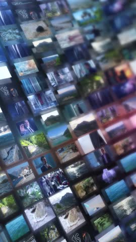 Multimedia screens displaying various videos and images, representing a digital gallery
