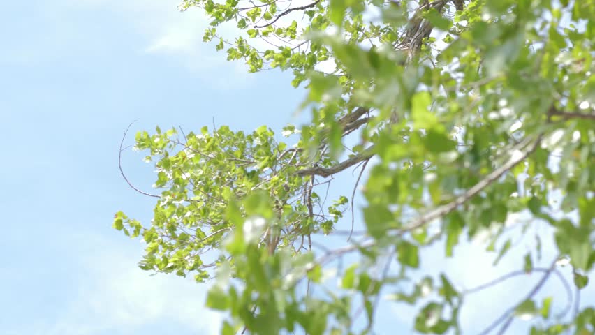 Slow motion tree with leaves blowing in the wind and summer sun while a pair of seagulls flies past in the background