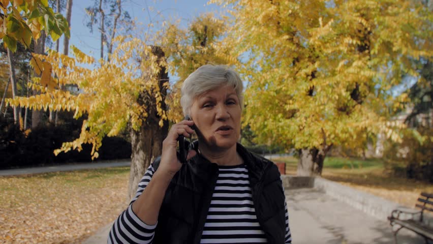 Elderly woman talking on a mobile phone while enjoying a walk in a beautiful autumn park