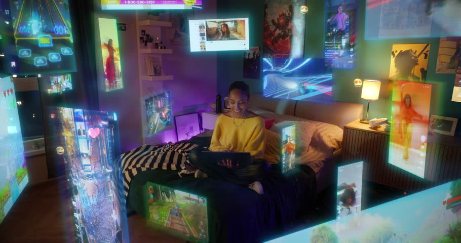Woman in a Cozy Neon Bedroom Browses Social Media and Streaming Sites on Her Laptop, Surrounded by Floating Digital Immersive Online Content, Entertainment. Rotating Cinematic Robot Camera Movement