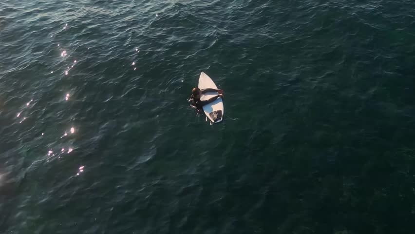 Slow motion video of surfer in the sea in sunlight beam.View from a drone