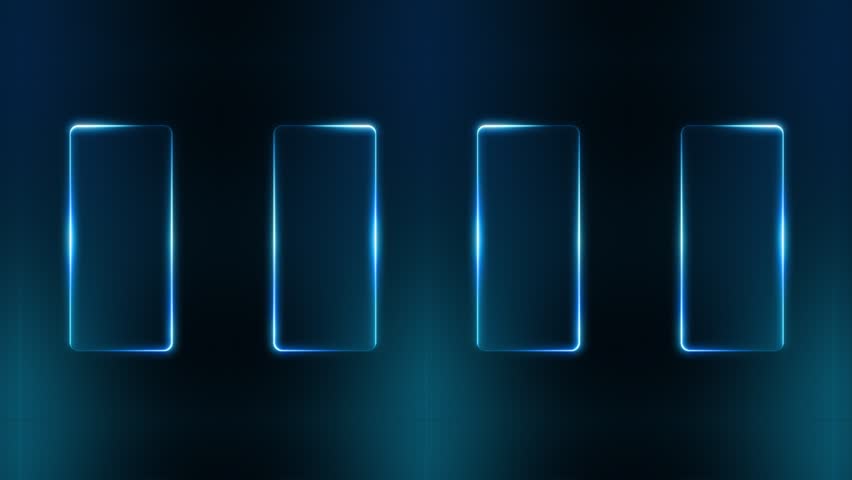 Four Vertical Floating Glass Interface Elements with Glowing Neon Blue Edges on Dark Empty Background for Modern Digital Technology Presentations and Abstract HUD Layout Designs
