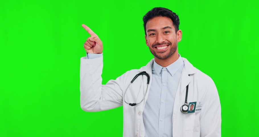 Face, doctor and man with green screen, pointing or choice with promotion, presentation or opportunity on a studio background. Portrait, male person or healthcare professional with decision or review