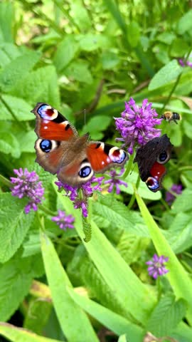 beautiful peacock butterfly sips nectar from vibrant flower in green garden. animal insect closeup