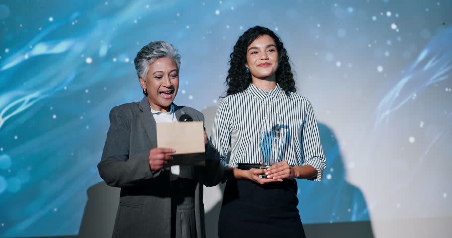 Business people, handshake and award ceremony with nomination at seminar for milestone achievement. Happy group, employees or shaking hands with smile or announcement for trophy or congratulations