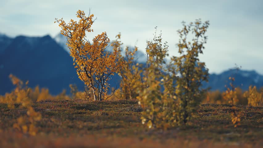 Birch tree covered in golden-yellow in the autumn tundra landscape. Snow-capped mountains in the background. Parallax. Bokeh.