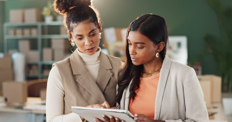 Women, designers and ecommerce conversation with tablet for company social media website, online and processing orders. People, digital technology and communication for startup business growth info.